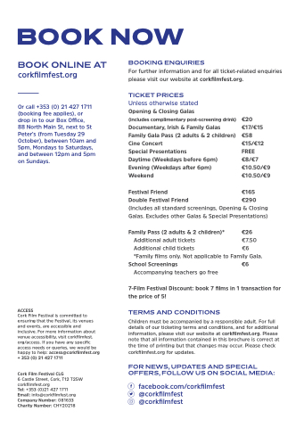 Children must be accompanied by a responsible adult. For full details of our ticketing terms and conditions, and for additional information, please visit our website at corkfilmfest.org. Please note that all information contained in this brochure is correct at the time of printing but that changes may occur. Please check corkfilmfest.org for updates.