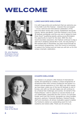 Our mission is to present a film festival of international quality and standing by curating a unique programme of exceptional films that connects audiences and artists in a shared cultural experience in Cork. With over 400 events, we have been voted one of the top 20 festivals to visit in Europe, and with our 64-year legacy we will continue to be a festival that challenges and excites. On behalf of the Festival Board, I wish to extend our sincere thanks to all our stakeholders, especially the Arts Council, our principal funder, and Cork City Council, alongside our many funders, sponsors, partners, Corporate Members, Festival Friends, staff and volunteers, all whose invaluable support enables the Festival to deliver an outstanding event for Cork residents and visitors alike. Thank you for joining us.