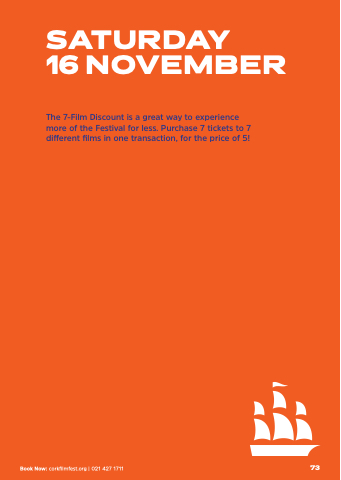 SATURDAY 16 NOVEMBER The 7-Film Discount is a great way to experience more of the Festival for less. Purchase 7 tickets to 7 different films in one transaction, for the price of 5! Book Now: corkfilmfest.org | 021 427 1711 73